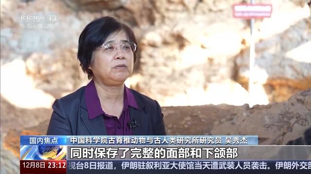 中国科学院古脊椎动物与古人类研究所研究员 吴秀杰:华龙洞人6号头骨同时保持了完整的面部和下颌部,面部扁平,并且下颌部出现了明显的具有现代人典型特征的下巴雏形,已经开始向现代人方向进行演化了。