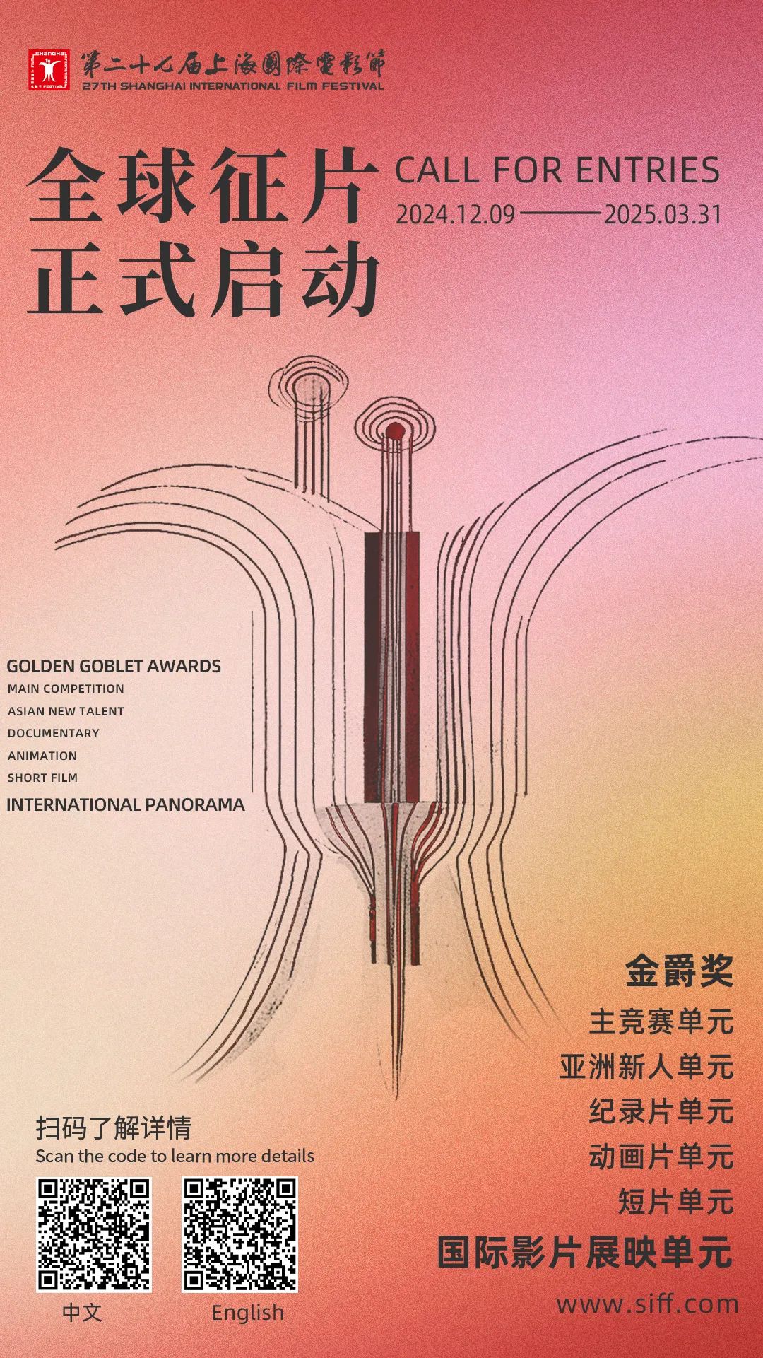 第27届上海国际电影节将于2025年6月举办。即日(12月9日)起,上海国际电影节面向全球启动征片,范围包含金爵奖主竞赛、亚洲新人、纪录片、动画片、短片五个竞赛单元,及国际影片展映单元。征片截止日期为2025年3月31日。
