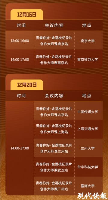 此外,本届盛典的配套活动“青春你好·金荔枝纪录片创作大师课”已于12月6日启动。在12月16日至20日期间,金荔枝纪录片创作大师课系列活动还将邀请国内外知名纪录片导演、制作人等,前往南京、北京、上海、武汉、广州、兰州等地高校,通过代表作品点映、创作分享会等多种形式,与广大师生和纪录片爱好者展开交流。