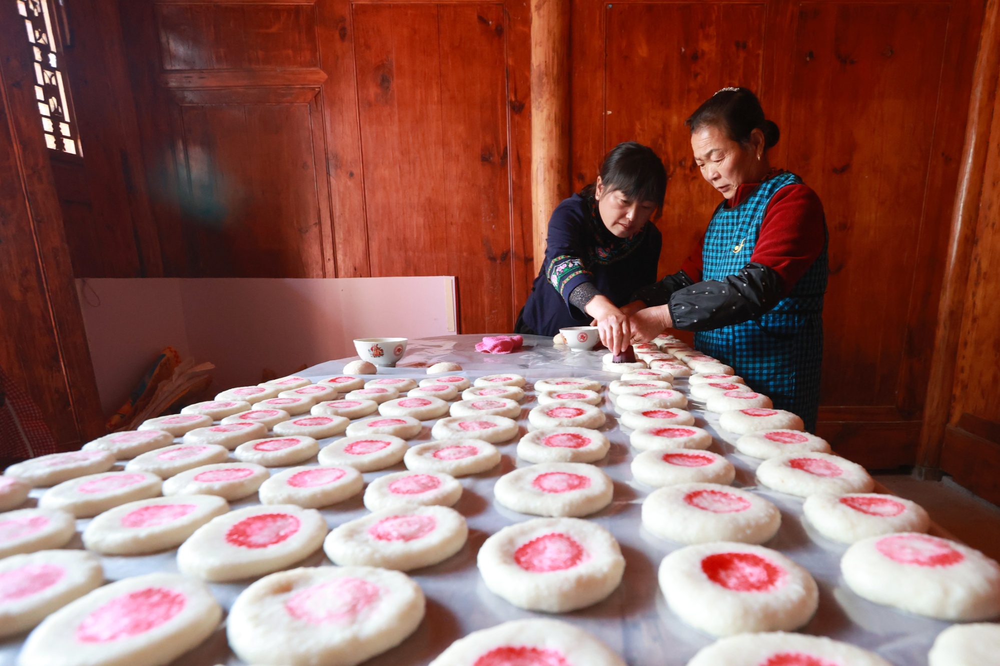 “首先要选择颗粒饱满、色泽洁白且无杂质的本地大糯米,将选好的糯米浸泡8到12个小时。上甑蒸煮是关键的一步,对火候和时间的掌控至关重要。蒸煮后的糯米要趁热捣烂做型,糍粑捶打需要力度、节奏和技巧的完美配合。”杨顺国说,打糍粑不仅是一项体力活,更是一门技术活,需要明确分工,男女协调配合,男人们负责捶打,女人们则负责蒸煮糯米和搓揉整形,当一甑甑糯米饭被捶打得绵软柔韧细腻,她们就趁热将其搓揉成一个个大小均匀、圆润饱满的小糍粑,并在每个糍粑上进行古老而充满寓意的“点红”仪式,使其增色添祥瑞,象征着生活红红火火,承载着人们对团圆、丰收和美好生活的期盼。