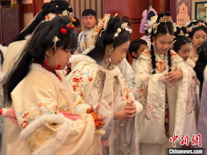 近日,2024年“少年长安行—中外青少年共聚长安文化交流”活动在西安举行。22日,青少年们“入乡随俗”换上汉服,走进唐风市井街区,与“白居易”互动、享受传统美食、学习唐朝礼仪,在市井之中品味着唐朝风韵。图为马来西亚青少年学习唐朝礼仪。杨英琦摄