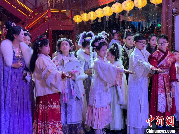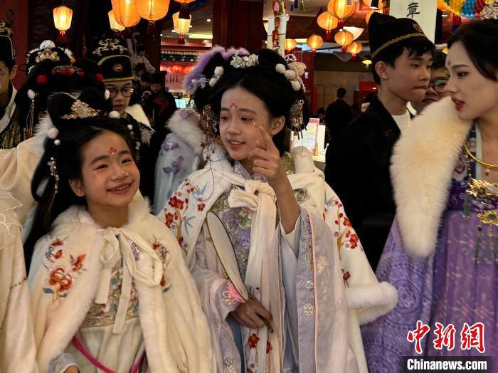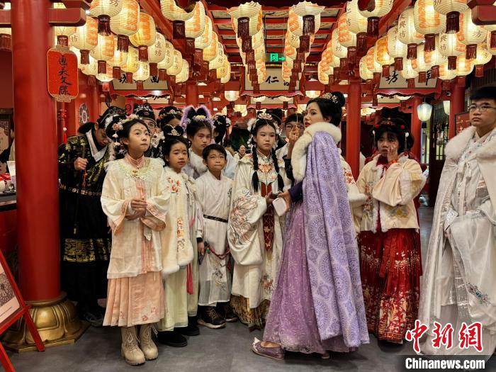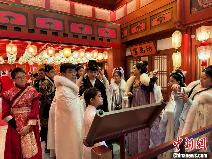 近日,2024年“少年长安行—中外青少年共聚长安文化交流”活动在西安举行。22日,青少年们“入乡随俗”换上汉服,走进唐风市井街区,与“白居易”互动、享受传统美食、学习唐朝礼仪,在市井之中品味着唐朝风韵。图为马来西亚青少年感受唐风唐韵。杨英琦摄