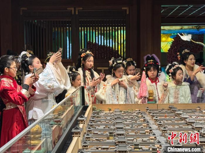 近日,2024年“少年长安行—中外青少年共聚长安文化交流”活动在西安举行。22日,青少年们“入乡随俗”换上汉服,走进唐风市井街区,与“白居易”互动、享受传统美食、学习唐朝礼仪,在市井之中品味着唐朝风韵。图为马来西亚青少年了解唐朝街坊布局。杨英琦摄