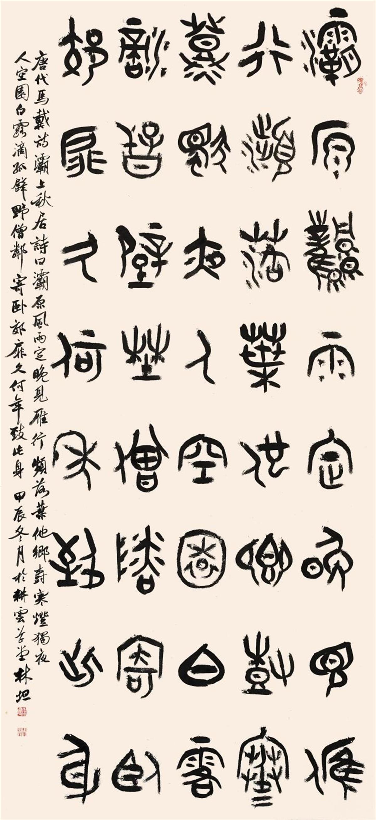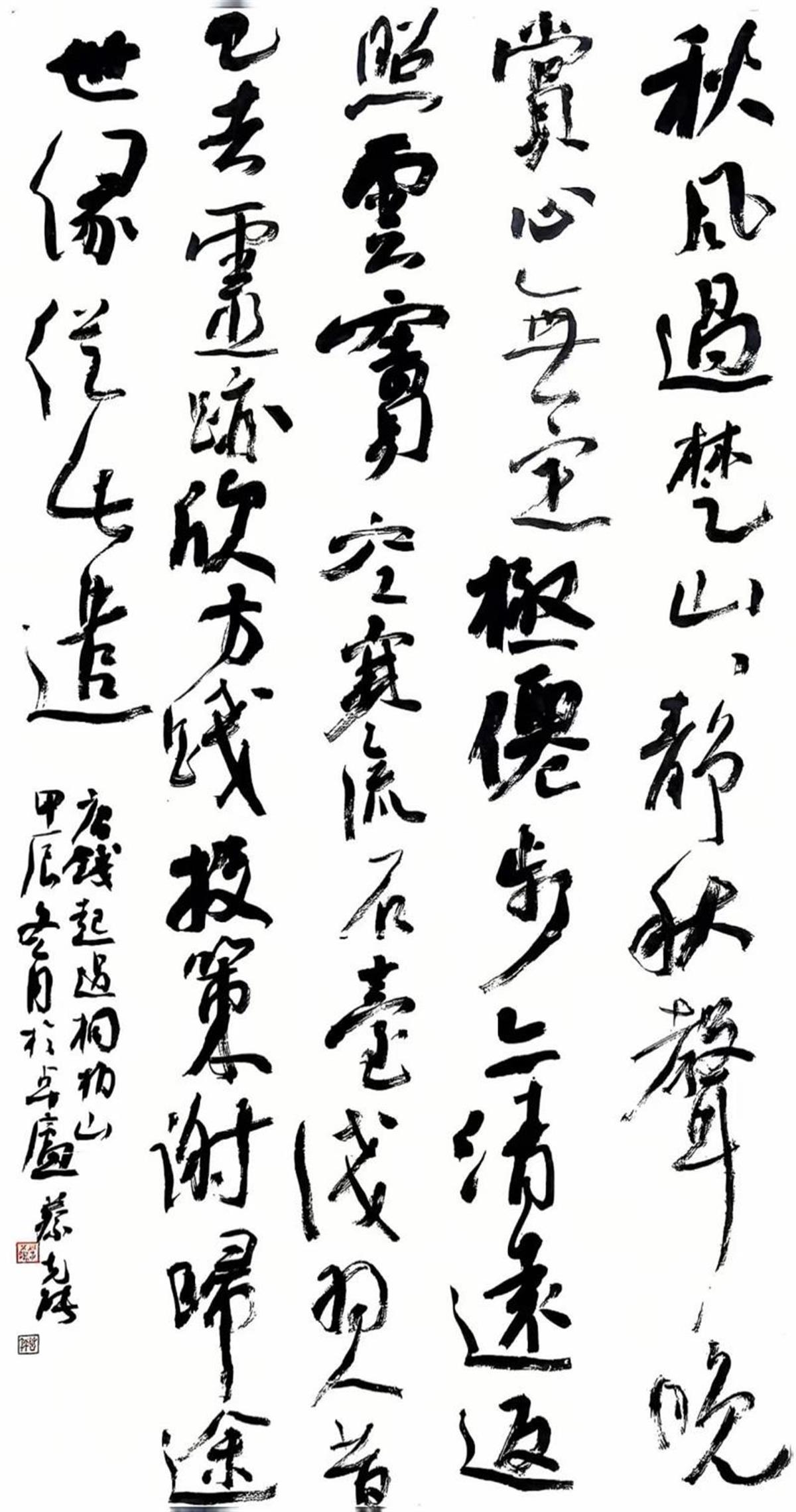 极目新闻记者品赏这些作品看到,两幅书法作品,一幅出自黄石市文联副主席、市书法家协会主席蔡克能之手,为颜体行书。内容选择唐朝钱起《过桐柏山》诗。诗文内容描绘秋日景象、表达诗人对自然和自由的向往和追求;一幅出自黄石市书法家协会副主席林坦,作品取法西周金文,书写内容为唐代马戴诗《灞上秋居》,诗曰:灞原风雨定,晚见雁行频。落叶他乡树,寒灯独夜人。空园白露滴,孤壁野僧邻。寄卧郊扉久,何年致此身。