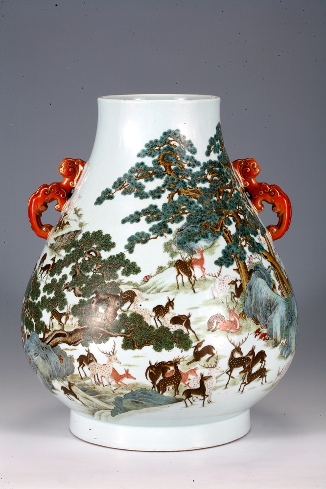 展出的“清乾隆款粉彩双凤耳百鹿尊”。(沈阳故宫博物院供图)