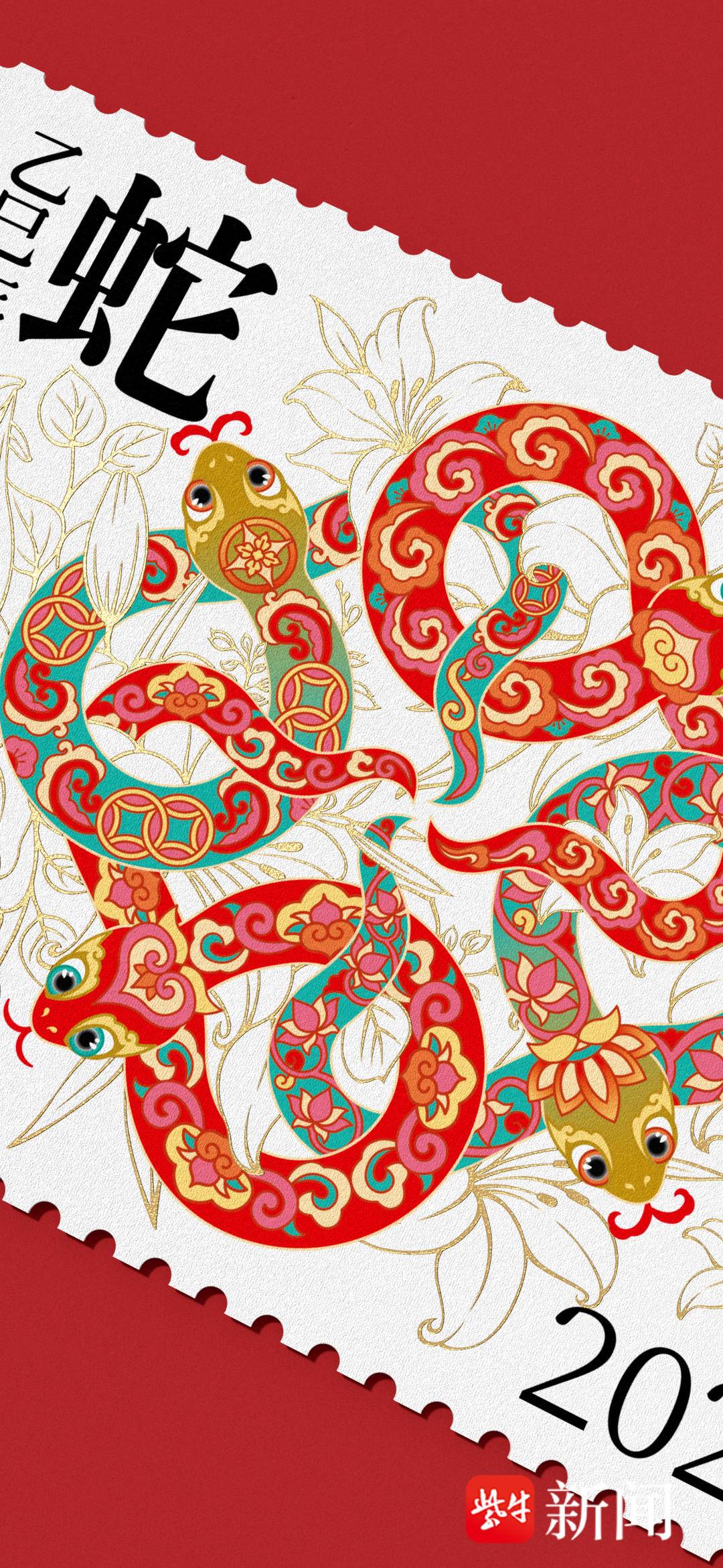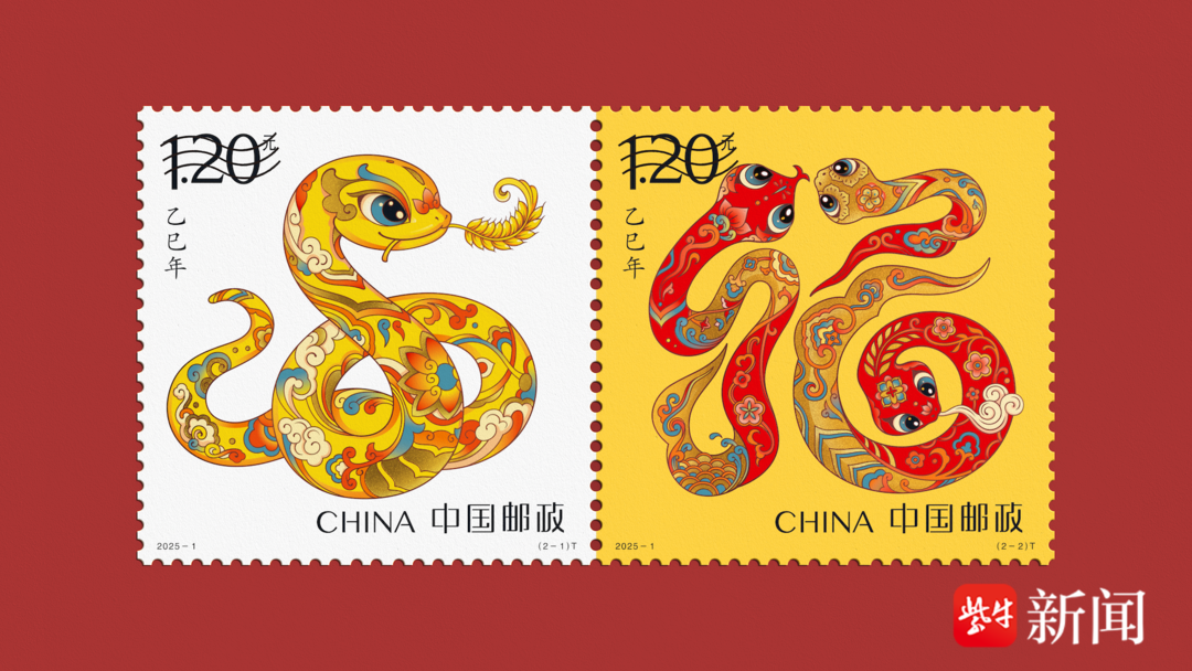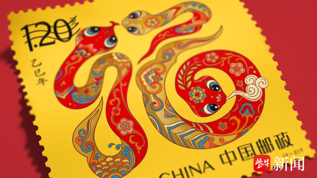 《乙巳年》特种邮票1套2枚,邮票图案名称分别为蛇呈丰稔、福纳百祥,由潘虎、张旺设计。潘虎目前是清华美院的一名在读博士生,另一位设计师张旺则是南开大学东方艺术系主任,主攻国画。“设计之初我们没有见过,中国邮政最终采取了我们两个人的图稿,最早定下来的是三条蛇组成的“福”字——福纳百祥。”《乙巳年》特种邮票设计师潘虎告诉记者,“与张旺老师的图稿在寓意上,正好形成了一种互补,后面也经过多轮修改调整细节,确保两枚邮票风格更加统一,相得益彰。”