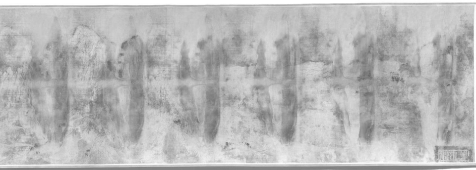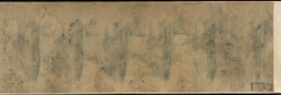 山东博物馆文保团队通过超景深显微镜观察,在画面左下部发现金色痕迹,用便携式X射线荧光光谱仪分析,发现金色痕迹为金属金(Au),合理推断原画使用了泥金颜料。对画面中绿色污渍进行X射线荧光分析,发现其铜元素(Cu)含量较高,远高于没有绿色污渍的区域,推断该部分绿色为水泡导致晕色的含铜颜料石青主要由蓝铜矿制成,化学成分为2CuCO3·Cu(OH)2)和石绿(主要成分是孔雀石化学式为Cu₂(OH)₂CO₃。通过对文物进行MSI多光谱拍摄,再通过描图手法提取其残留线条,分析其绘画风格,基本可以推断为宋至元代青绿山水图。