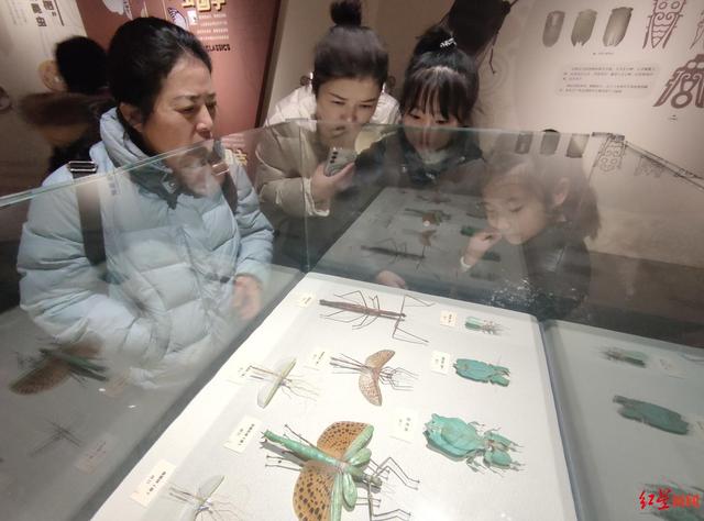 红星新闻记者了解到,本次展览由自贡恐龙博物馆和国家自然博物馆携手打造,展出的近240件展品均来自国家自然博物馆“宝藏库”,包括鳞翅目(以蝶类、蛾类为代表)、鞘翅目(俗称甲虫)、直翅目(以螽斯、蟋蟀、蝗虫为代表)、膜翅目(以蚁类、蜂类为代表)、蜻蜓目(以蜻蜓、豆娘为主)等12目昆虫标本,蛛形纲、肢口纲、唇足纲等4种节肢动物标本,以及蜚蠊目、蜉蝣目、脉翅目等5目古昆虫化石。游客们可以通过放大镜仔细地观察到这些昆虫的身体细节,从中感受乐趣、获得知识。