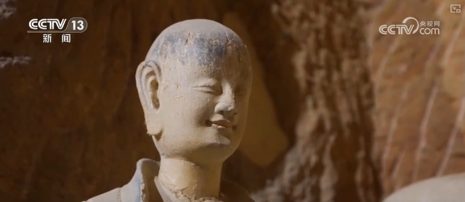 麦积山石窟的独特之处在于,雕塑的人物形象更加贴近生活,充满人间温度。第133窟的小沙弥眯着双眼、嘴角上扬,天真烂漫的“微微一笑”,触动无数游客的心。第44窟的造像,更因为慈祥平和的微笑被称为“东方美人”,阐释了古人对于东方美的理解与表达。