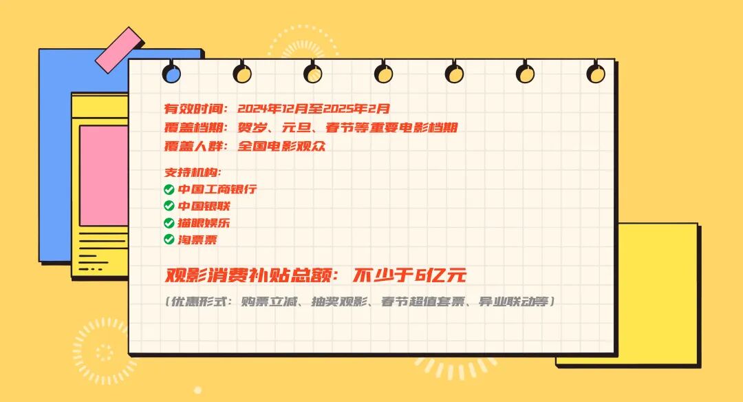 淘票票:2024年12月9日至2025年2月28日,用户可通过淘票票App、微信淘票票小程序、支付宝淘票票小程序、淘宝淘票票小程序首页“全国电影惠民消费季”或“政府补贴”进入活动专题页领取5—50元红包,并且同时可享受淘票票买一赠一、淘麦VIP积分礼包、88VIP全年观影优惠券、影迷月活动。