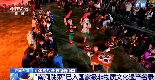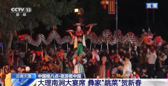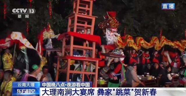 总台记者 罗坷欣:南涧彝族自治县公郎镇板桥村的中心广场上,浓浓的民族风情从上菜环节就已经开始了。这些彝族汉子,头顶着托盘踩着彝族音乐节奏,跳着幽默诙谐舞步,把菜送到大家桌上。他们说这是彝族“跳菜”,是歌舞与美食相结合的一种独特上菜礼仪。