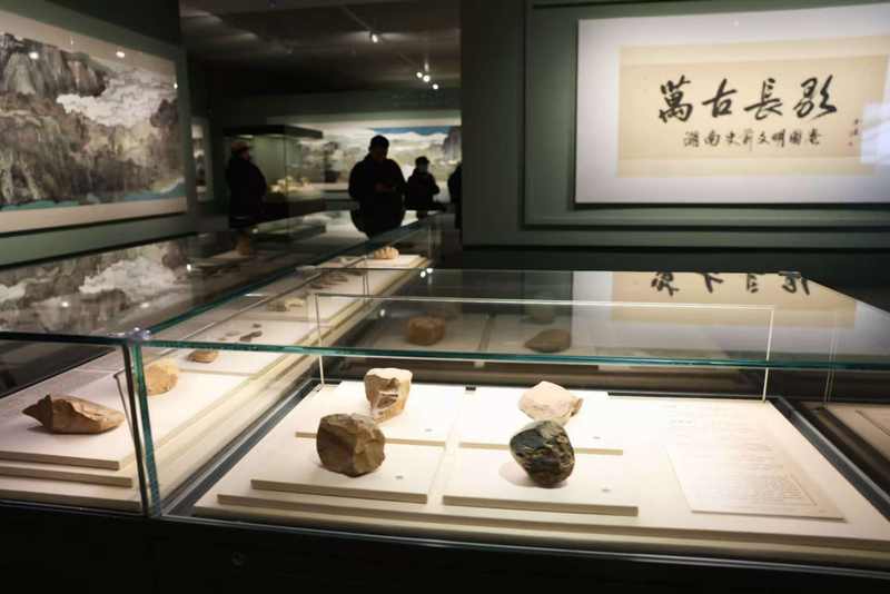 对应《万古长歌·湖南史前文明图卷》的七个部分,展览精选了49组(91件)湖南史前文明考古文物(含石器、骨器、陶器、玉器等)同步展出,对每件文物进行阐释,增加了展览的丰富性、生动性和知识性。