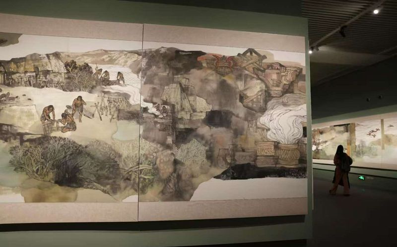 该画卷运用现实主义和浪漫主义相融合、具象和意象相结合的艺术表现手法,勾勒了湖湘先祖在史前人类历史中从原始生活方式跃升至文明门槛的传奇。它曾于2023年12月在湖南首展,本次展出作品是主创艺术家团队用近一年时间再次补充、打磨、优化后的匠心之作。