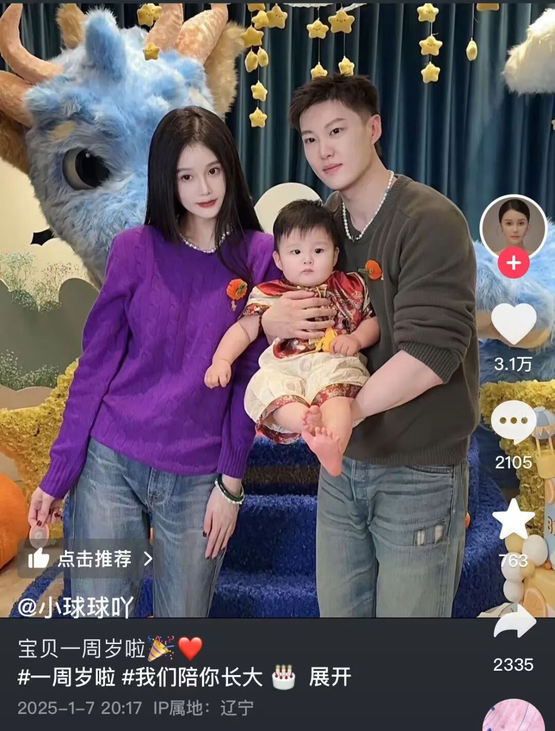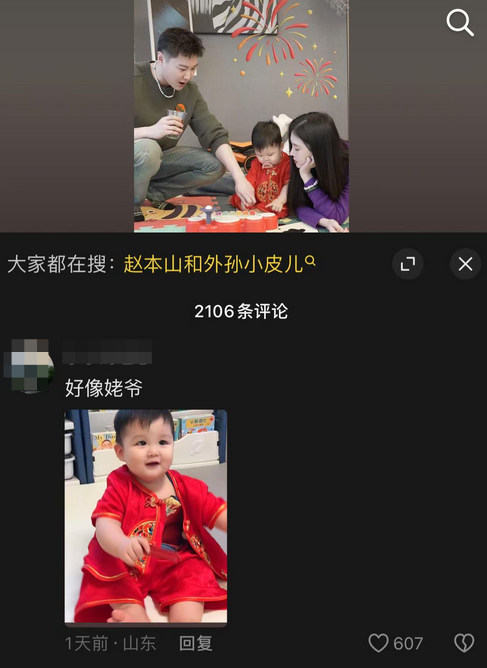 照片中,球球一家三口出镜,她穿着紫色毛衣和牛仔裤,妆容精致,丈夫打扮休闲,1岁的儿子白白胖胖,十分可爱。对此,大批网友感慨小宝宝像赵本山:“好像姥爷!”