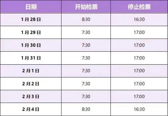 春节假期第一天(1月28日)和最后一天(2月4日),开放时间为8:30-18:30(16:30停止检票),按照最大承载量65000人投放门票,即65000张。
