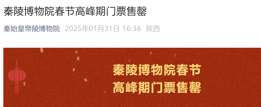 1月31日,秦始皇帝陵博物院发布消息称,秦陵博物院春节假期参观接待已进入高峰期,根据门票预定情况,目前秦陵博物院2月1日、2日(初四、初五)门票已经售罄;2月3日(初六)门票已基本售罄,如有少量退票将及时上架;2月4日(初七)门票尚有余量。