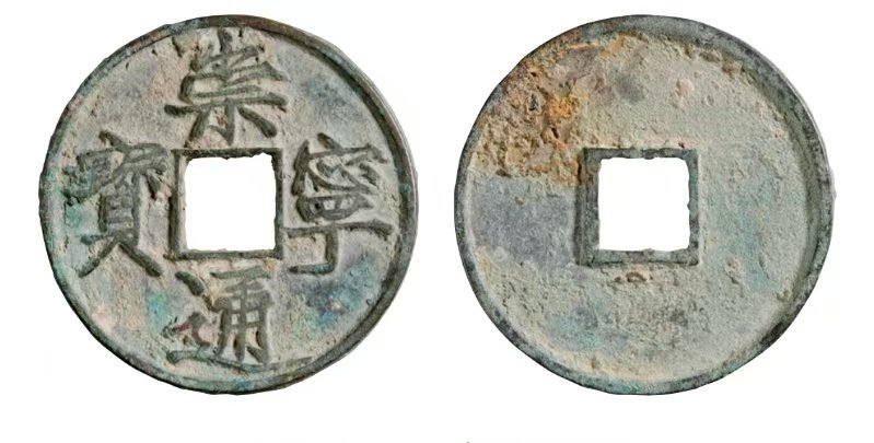 △崇宁通宝,直径34.9毫米,厚2.6毫米,重11.6克。北宋徽宗赵佶崇宁年间(1102—1106年)铸造,年号钱。钱文为徽宗亲书瘦金体,所以又称其为御书钱,也被称为中国最美古钱币。沧州博物馆藏