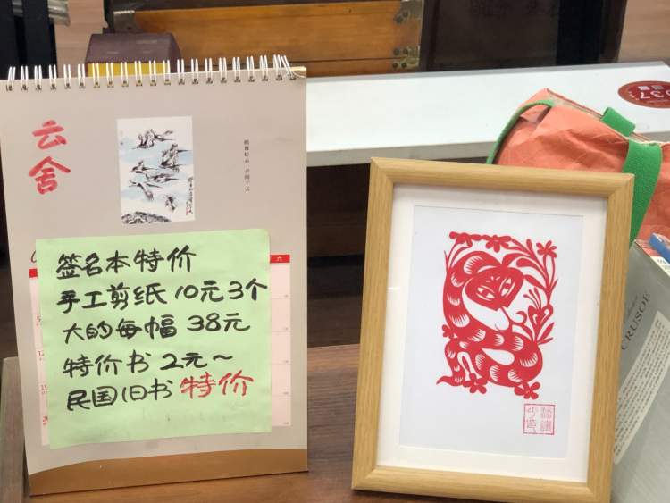 年初四晚上,在家包完春卷之后,市民、书友“一片云”开始准备第二天旧书市集的摆摊。“第12次摆摊恰逢年初五,迎财神,很喜庆。云舍的文创添新,花样蛇剪纸,一款仅一枚,还有二幅大的剪纸。”当天晚上,“一片云”先在朋友圈进行预热,以便让自己的几千位好友知晓。