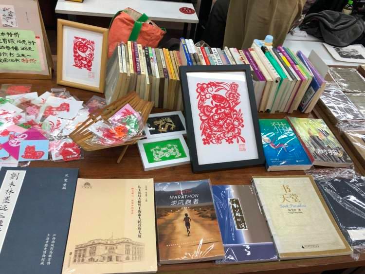 “一片云”在新年旧书市集摆摊的花样蛇剪纸和书籍