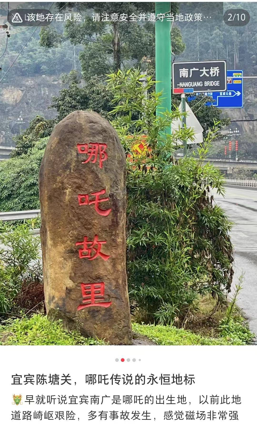 现下,宜宾的哪吒行宫、有哪吒重生传说的天池公园还身阁、传说是三太子敖丙化身的龙脊石、哪吒古庙、将军石等地都是宜宾哪吒游攻略中的热门打卡点。还有一个讨论度比较高的景点是四川江油的金光洞,在民间传说中这里是哪吒师傅太乙真人的道场,电影中太乙真人一口四川话也是由此设定而来。