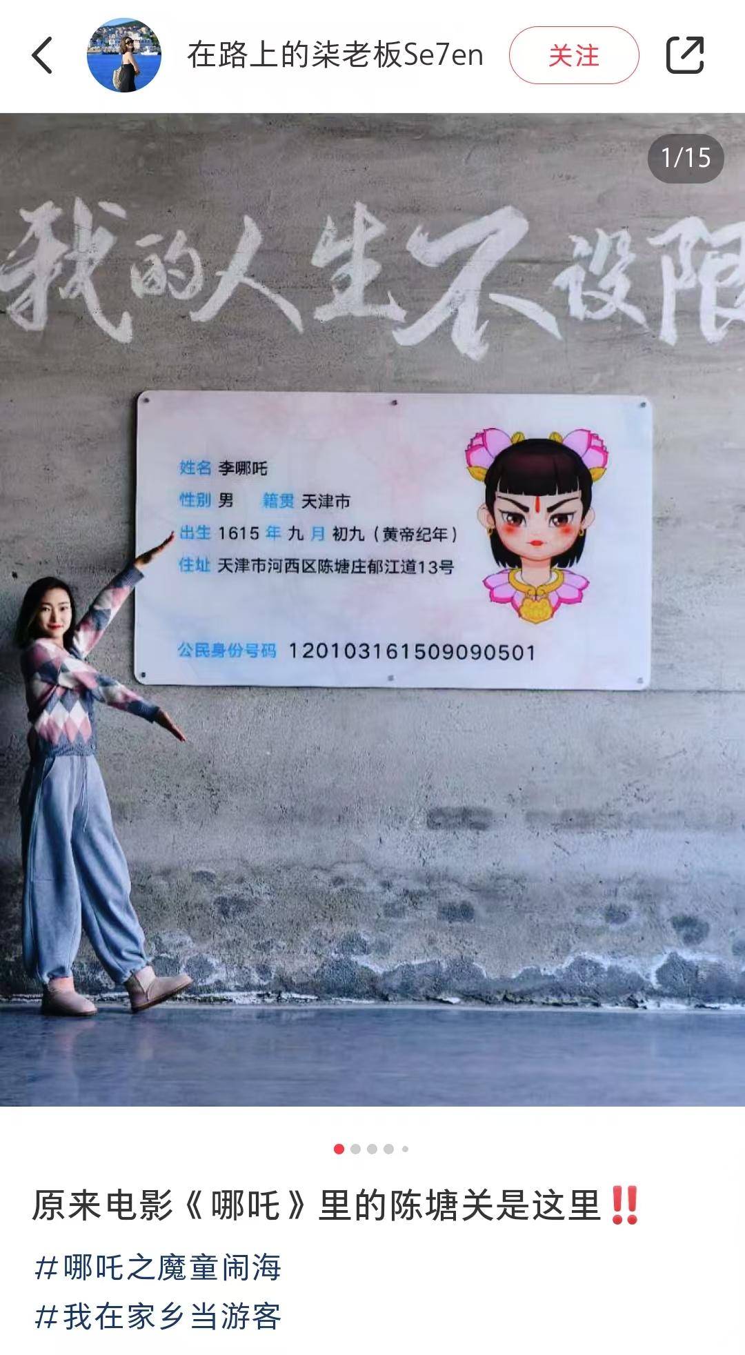“从地铁陈塘庄站出来,到事发地影院沉浸式看电影,看完电影找一家天津菜馆,品尝一道干煸鱿鱼须,之后到哪吒小镇和哪吒的身份证合影。这一天的哪吒主题游就圆满了。”这是旅游博主们推荐的“天津哪吒主题旅游线路”,哪吒小镇里印着“120103”开头(天津市河西区)的“哪吒身份证”,成为不少网友拍照留影的必选项。