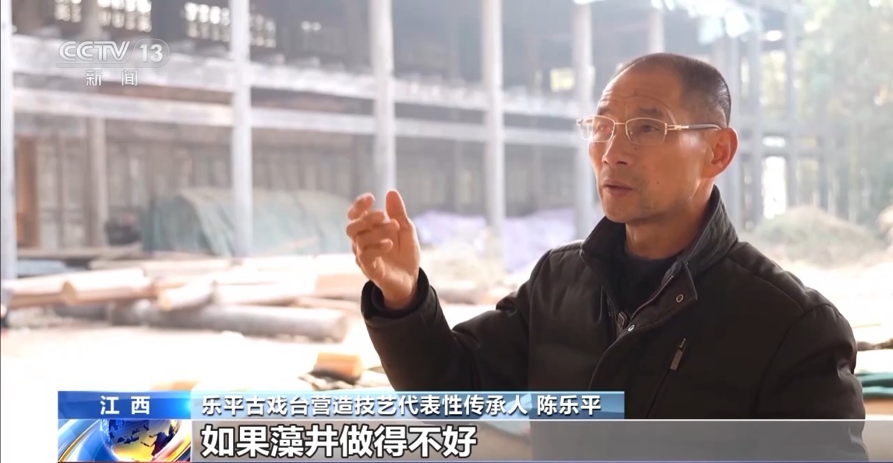乐平古戏台营造技艺非遗传承人 陈乐平:古代人做螺旋顶,做得越好的,回音就响亮。如果藻井做得不好,古代没有扩音器,做得不好回音就回不出来。