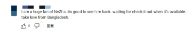 “我是哪吒的超级粉丝,看到他回归真是太好了。等影片上映就去看。来自孟加拉国的爱。”