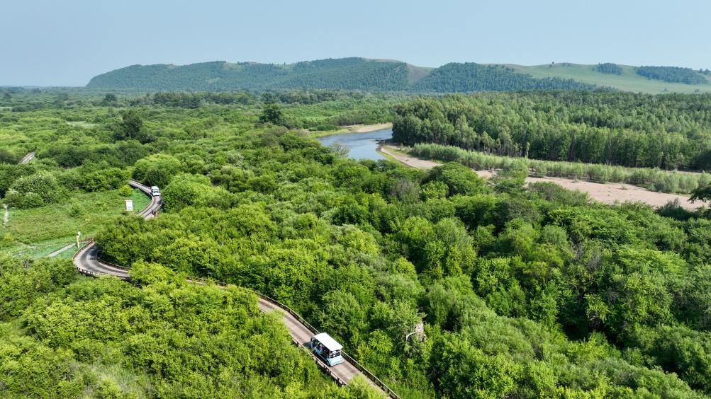 2024年7月2日,游客乘车在呼伦贝尔市额尔古纳国家湿地公园游玩(无人机照片)。新华社记者 贝赫 摄