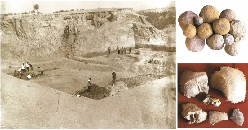 △1970年代,侯家窑遗址发掘现场及出土石球、古人类化石