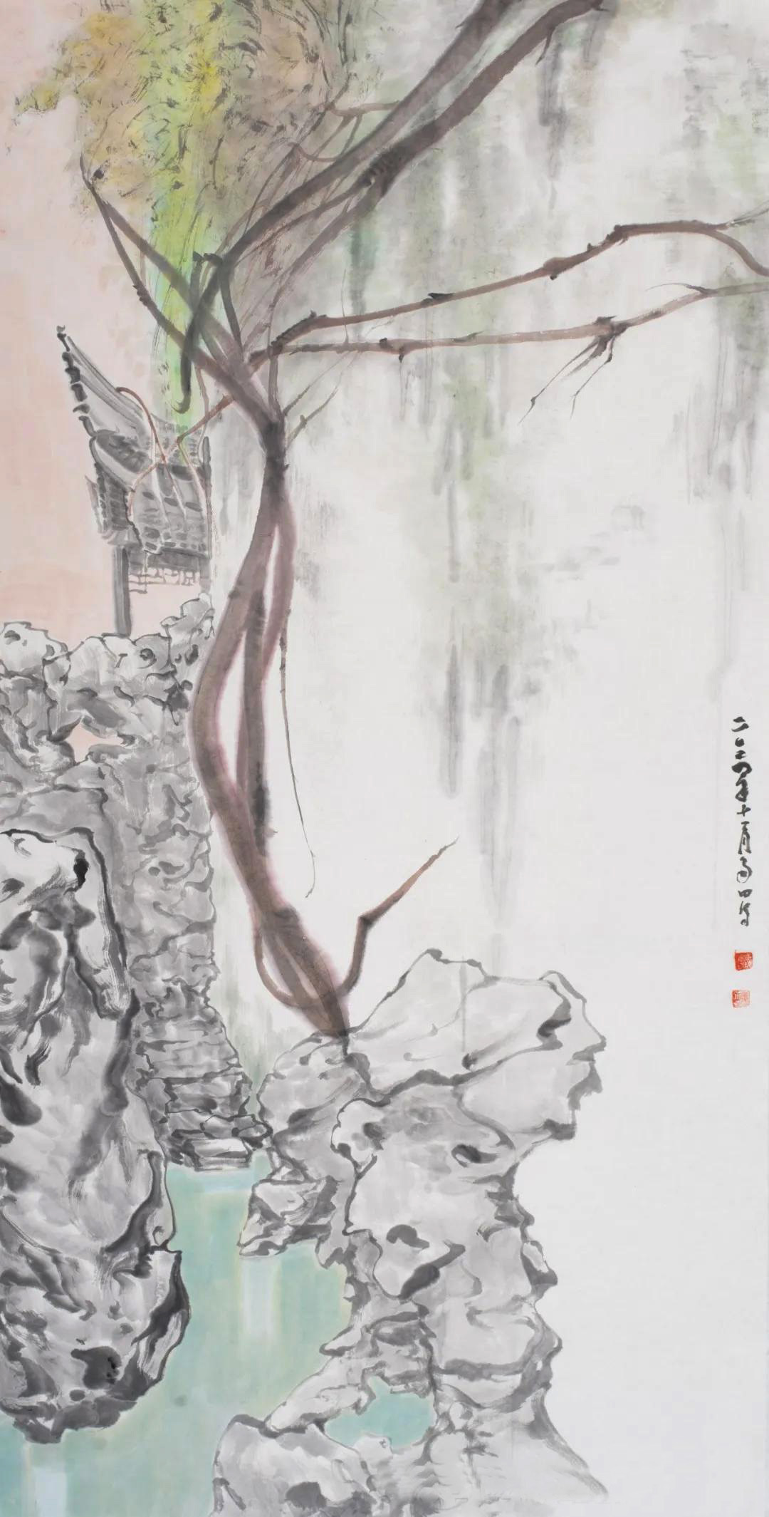 后来与董雷熟悉以后,我对他有了更深入的了解,他非常不简单。他曾是扬州宣传文化战线的一位领导干部,理论水平和艺术水平都很强。退休以后,他把所有的时间都投入到艺术创作上,艺术成果颇丰,尤其是中国画连续入选十三届、十四届全国美展,达到了一个新的艺术高度。