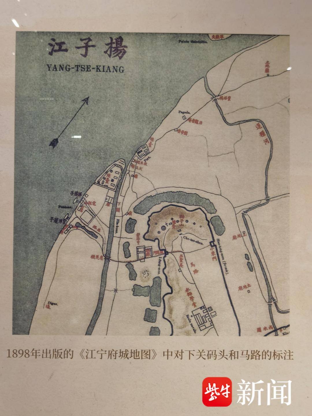 在本次展览中有一张地图非常值得关注,这张1898年出版的《江宁府地图》中标注了下关码头和马路,地图上还有个非常小的船形标志,这是一个叫做“洋棚子”的码头,“这张地图是南京近代史上第一张采用科学比例尺制作的地图,反映了南京在正式开埠通商前下关地区的情况。”该展策展人、太平天国历史博物馆综合业务部主任孔令琦介绍到。这张地图由法国传教士盖拉蒂(中文名为方殿华)绘制,是迄今能看到的最早一幅经过精确测绘,带比例尺、标注经纬度的南京地图。“地图上的马路是张之洞在1895年主持修筑的连接江宁下关江边至城内总督衙门的江宁马路,此为南京首条近代市政道路。今天的大马路和建宁路仪凤门段就是其旧址。而这个在地图上不太起眼的洋棚子最初是美资旗昌轮船公司修建的码头,后来旗昌轮船公司被中国轮船招商局收购了,洋棚子实际上是南京历史上第一个正式的轮船码头。”