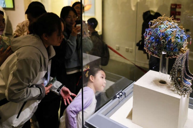 观众在“古代中国”基本陈列观看凤冠文物。中国国家博物馆供图