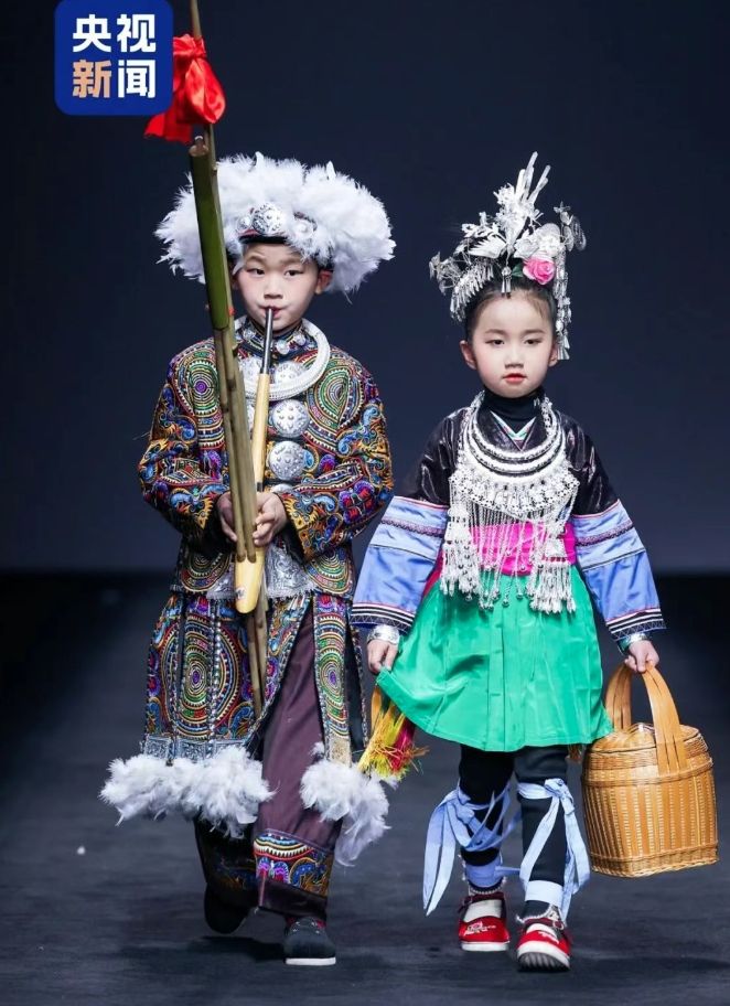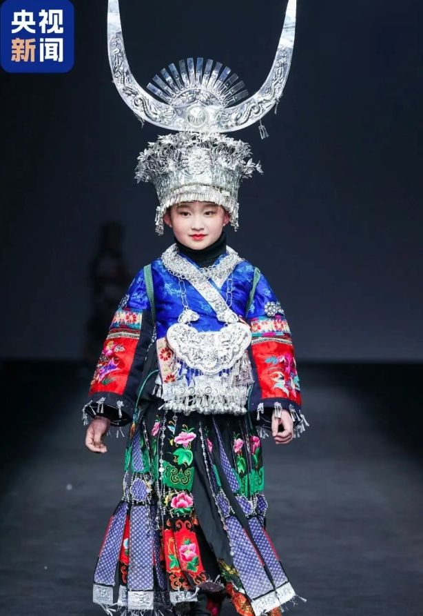 T台上,孩子们的步伐稚嫩,举手投足间尽显质朴与自豪。他们的盛装绣着独特的图案,色彩斑斓,融合了苗绣、侗族绣、壮族背带绣、蜡染等非遗元素,精致的银饰在灯光下闪烁,满是民族韵味。