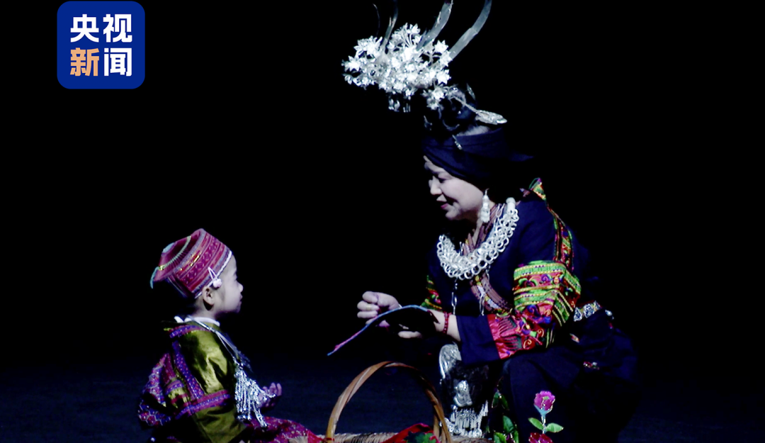 孩子们的手里或是捧着台江姊妹饭,或是提着丹寨鸟笼,篮子里装着苗家血豆腐,背篓里盛着贵州苗药,还有的挑着扁担,一头挂着鲜鱼,一头挂着折耳根……他们自信地向观众招手,展示着家乡的风物。
