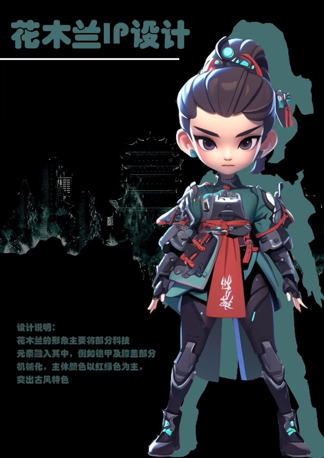 作品设计制作两套花木兰的戎装IP形象,同时制作一套花木兰凯旋归乡之后的女装IP形象,并在最后设计一套传统与现代理念结合的赛博朋克风格IP形象。基于这些形象创作系列周边,延伸到产品落地。