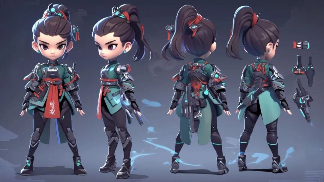 作品设计采用绿色与红色交织的未来风格战服,金属质感的设计元素让整套服装看起来既时尚又充满力量感。两个高高的马尾辫,搭配黑色发饰,不仅展现了她的英姿飒爽,还巧妙地融入古典元素。在花木兰的左肩上有一个通讯装置,不仅体现未来战士的必备装备,还巧妙地与花木兰的传统形象相结合,让人联想到她在古代战场上传递军情、指挥作战的英勇形象。作品保留了花木兰作为女英雄的英勇与坚韧,并通过现代科技元素的加入,为她注入新的活力与魅力。