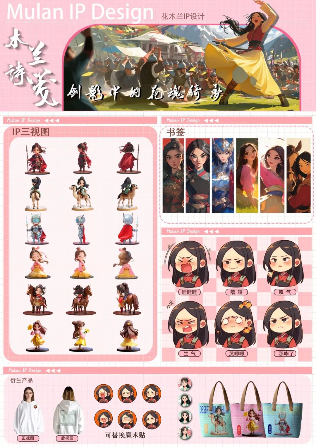 作品以花木兰的巾帼英雄形象为核心,结合景区的自然景观元素,塑造一个既英勇坚毅又充满生机活力的IP角色。该IP形象可广泛应用于景区的各类宣传推广,以IP形象为主题的人偶可与游客互动拍照,增强游客的参与感与游玩乐趣。周边产品如玩偶、别针、手提袋、服装等,也将凭借IP形象的吸引力,成为游客喜爱的纪念品,进一步扩大木兰景区的品牌影响力。