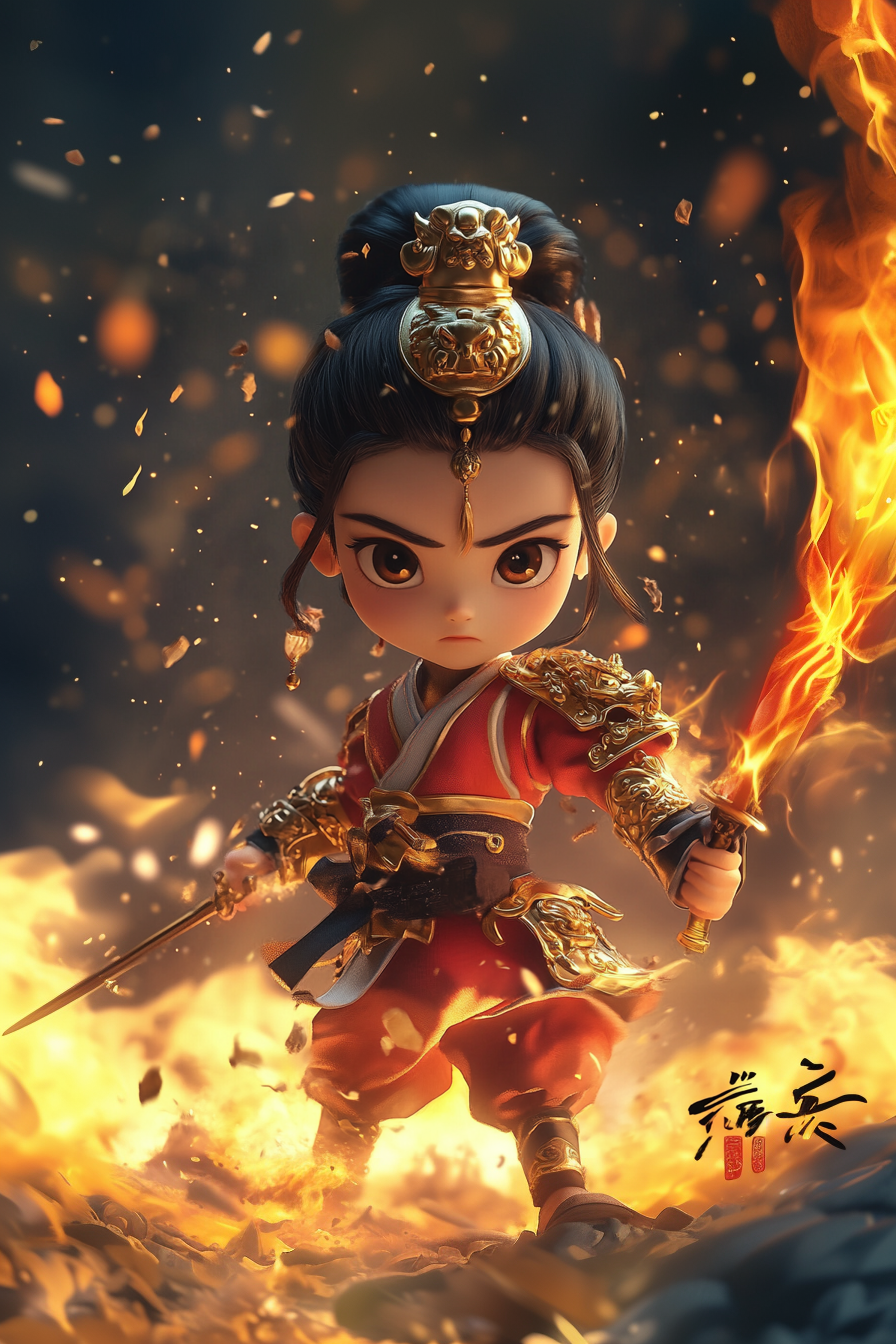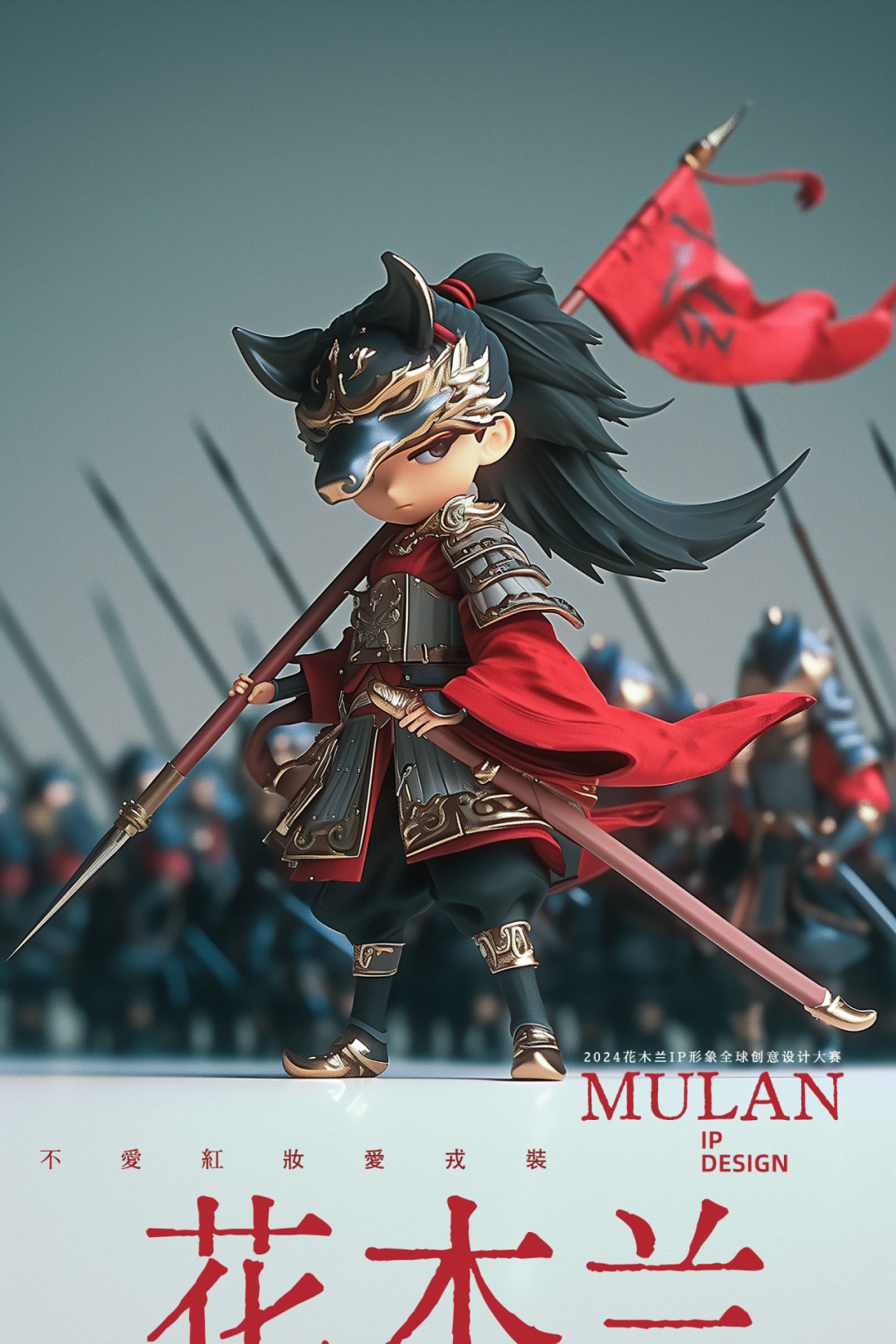 作品将传统文化与现代艺术形式相结合,赋予花木兰全新的生命力,展现了她的英雄气概与独特魅力。红色战袍与金色铠甲的搭配象征权威、荣耀与热血,同时细腻的龙纹装饰和头顶的金冠点缀突出了花木兰的英勇身份。她手执利剑、目光坚定,展示了女性的强大与不屈不挠的精神。这种Q版形象独特的可爱风格为花木兰这一传统英雄赋予了更多的亲和力和现代感,为产品化提供丰富的开发空间。