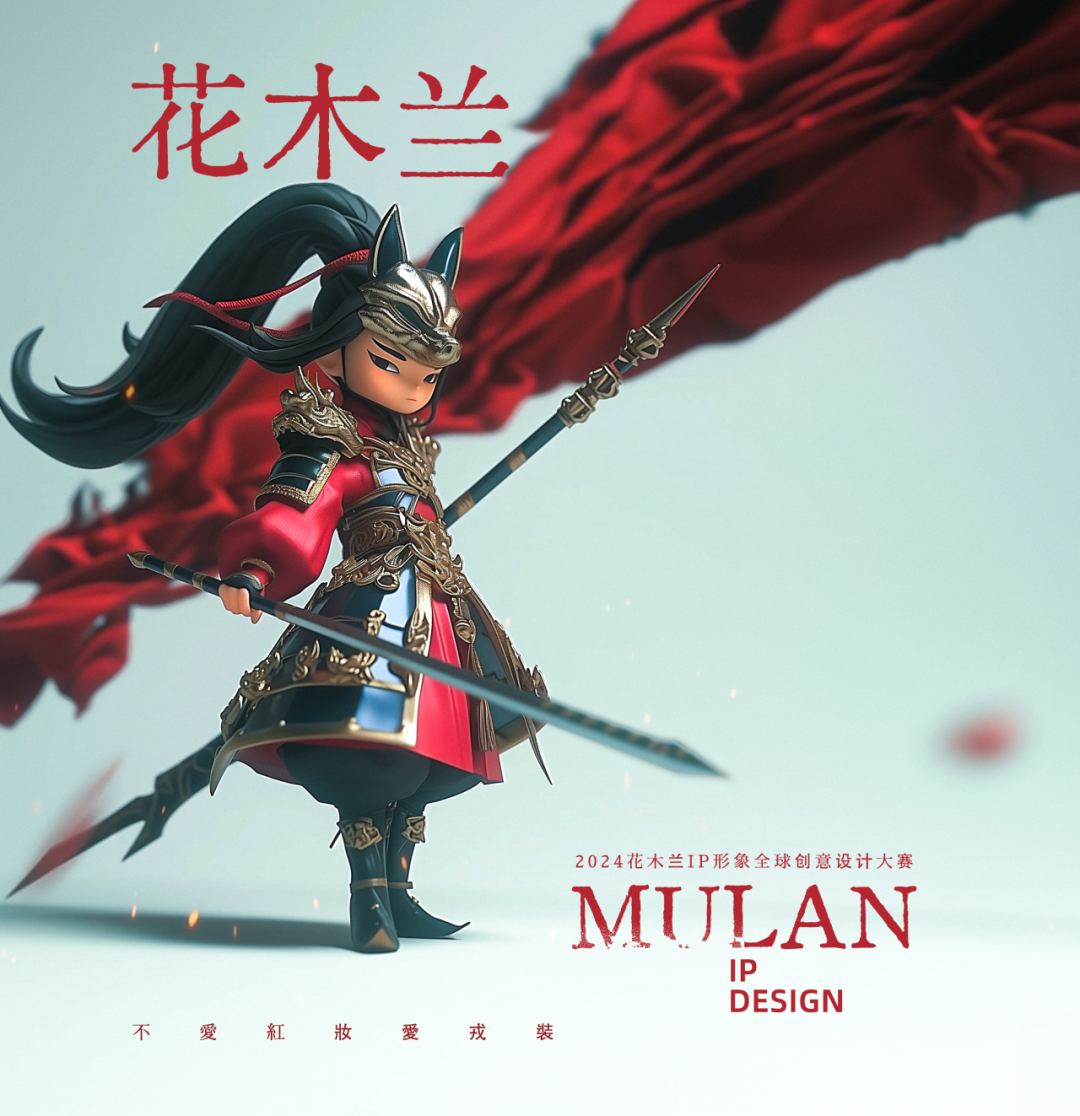 作品结合当下流行文化和审美趋势,对花木兰形象进行创作,使其更符合现代观众尤其是年轻人的喜好。设计理念注重传承花木兰所代表的忠孝勇节等中华传统美德以及木兰文化的精神内涵,展现其既有女性的细腻温情,又有超越性别的豪迈大气,体现中华女性英气率性之美。