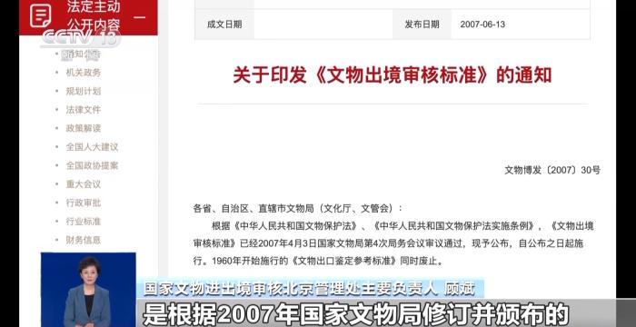 国家文物进出境审核北京管理处主要负责人 顾斌:近年来,我们出台的文物出境审核规范,是根据2007年国家文物局修订并颁布的文物出境审核标准,规定了出境的很重要的一个时间线,实际上是为我们文物出境审核提供了一个基本依据。