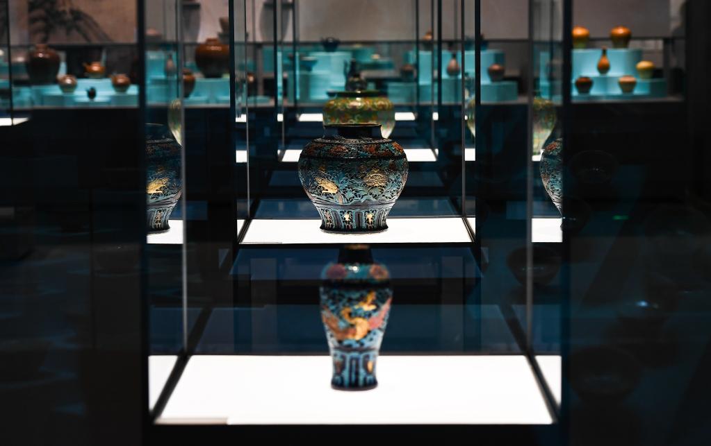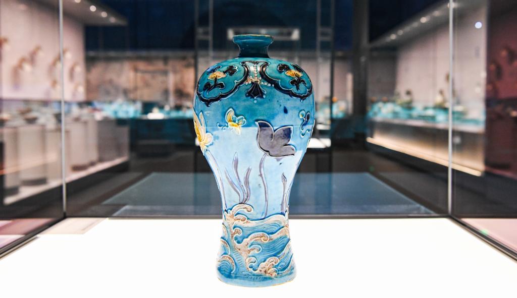 这是从一号沉船遗址出水的珐华彩孔雀蓝釉莲池纹梅瓶。新华社记者杨冠宇摄