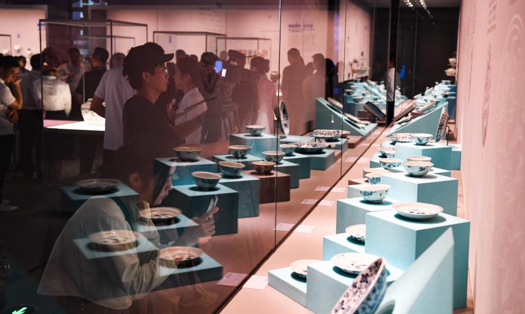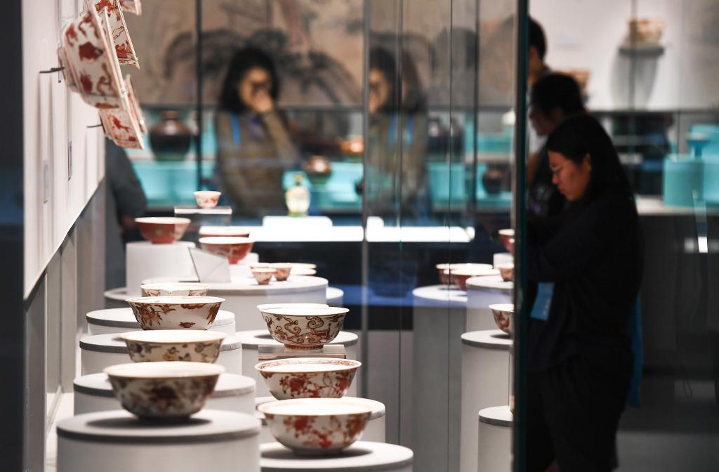 观众在参观一号沉船遗址出水的红绿彩碗。新华社记者杨冠宇摄
