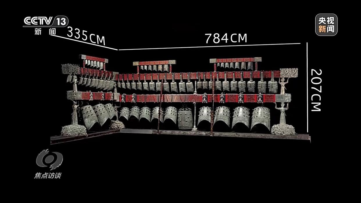 湖北省博物馆陈列展览部主任 曾攀:敲击钟的正鼓部能发出一个声音,敲击它的侧鼓能发出另外一个声音。一钟双音,是中国编钟的一个伟大发明,但是汉代之后这个知识逐渐失传,曾侯乙编钟的出土证实了中国古代具有这样的制造乐器的先进知识。