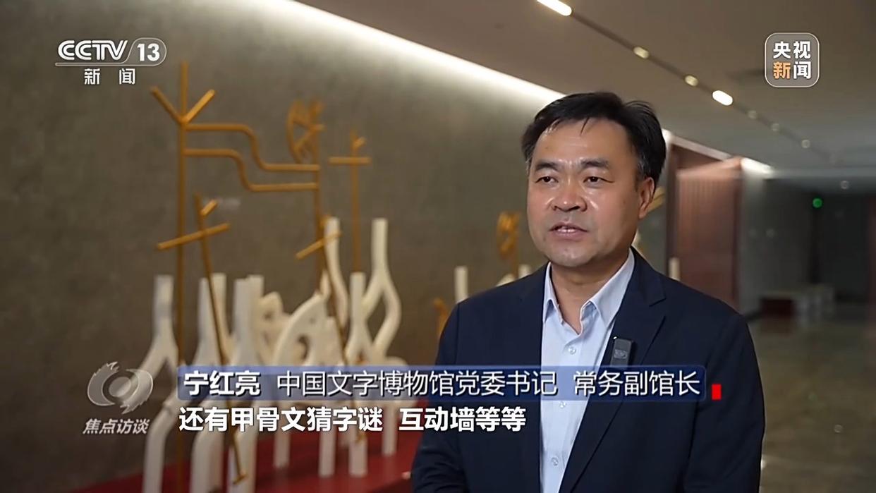 中国文字博物馆党委书记、常务副馆长 宁红亮:馆内全方位展示了甲骨文字的发展演变过程,还建设了3D裸眼甲骨文展示、甲骨文猜字谜互动墙等沉浸式数字展陈系统。我们开发了360多款甲骨文元素文创产品,实现了让传统文化与现代生活的紧密相连。