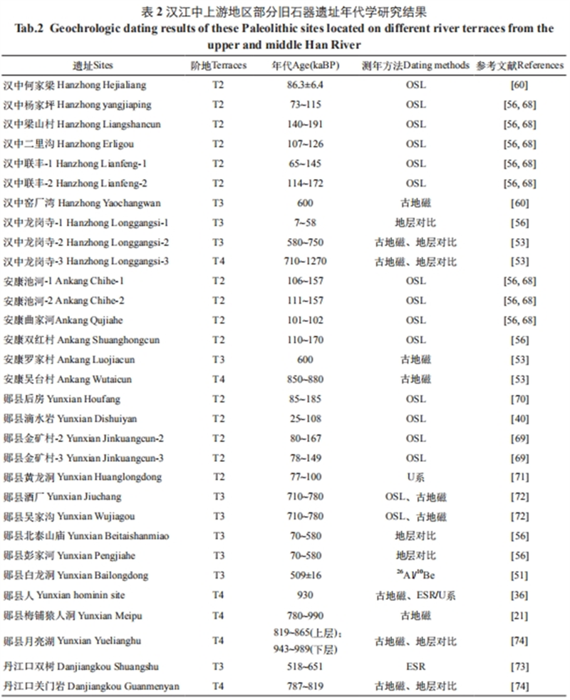 《研究进展》一文还对比分析了汉江中上游阶地{含汉中盆地、安康盆地、郧阳(郧县)盆地}的发育历史研究和汉江中上游阶地上旧石器与古人类遗址的年代数据研究(见以下原文表2),并作出结论:在距今127--71万年,亦即距今100万年前后,汉江中上游存在一期人类活动,主要生活在T4阶地之上,而“郧县人”可能就是该人群的组成部分。