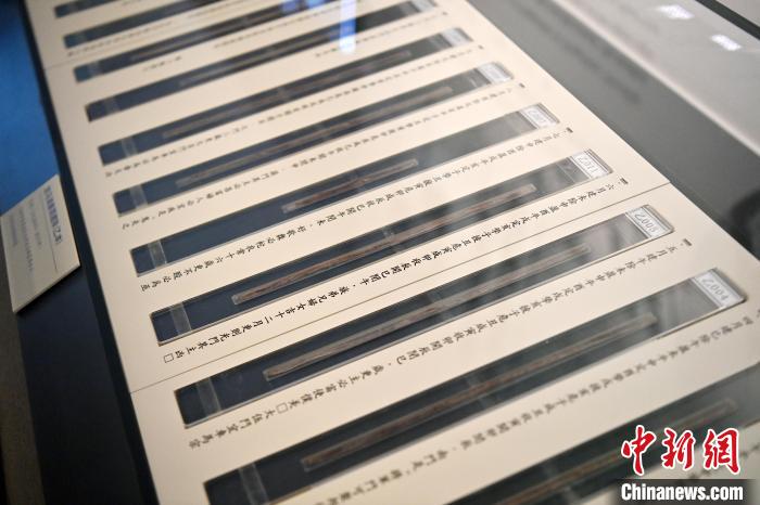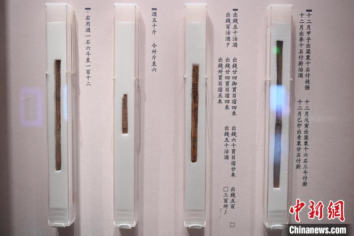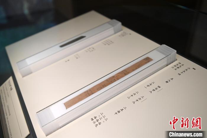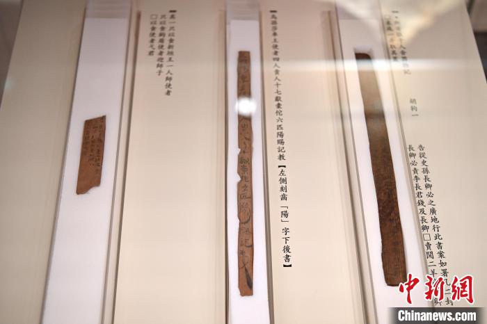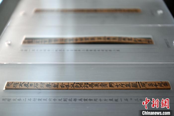 图为甘肃简牍博物馆展出的记录了古代交易物资的汉简。 中新社 记者 九美旦增 摄