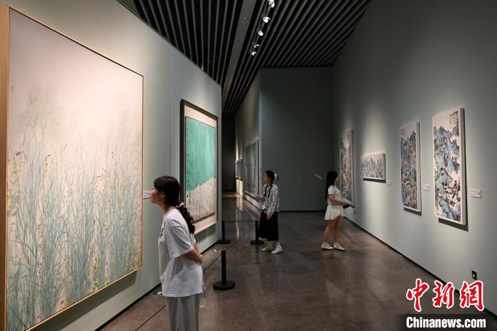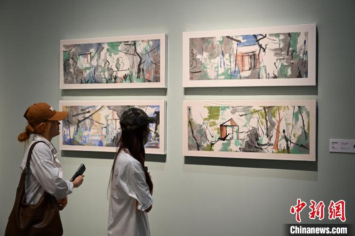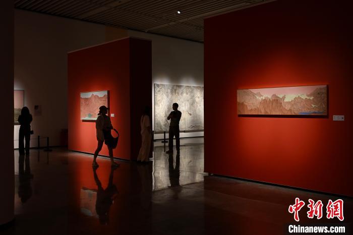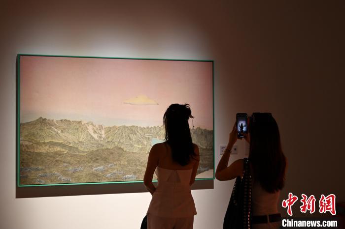 4月29日,“五色·万象——中国传统色现代性转译研究展”展出贺海锋《无忧的云》吸引参观者。 中新社 记者 陈楚红 摄