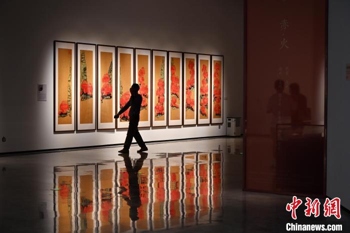 4月29日,“五色·万象——中国传统色现代性转译研究展”展出林蓝的作品《勃发》吸引参观者。 中新社 记者 陈楚红 摄