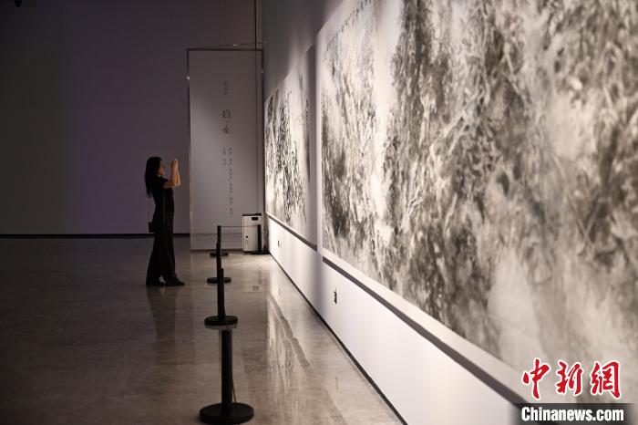 4月29日,“五色·万象——中国传统色现代性转译研究展”展出方土的作品《岁寒三友·雪竹》吸引参观者。 中新社 记者 陈楚红 摄
