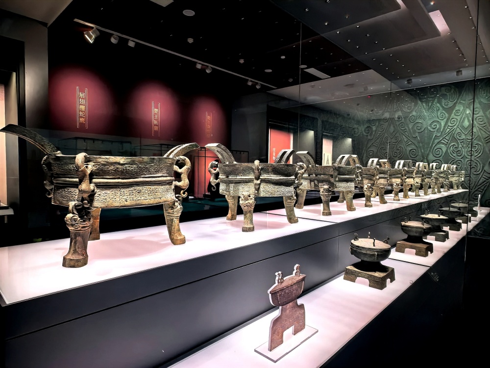 安徽博物院首次展出的楚幽王陪葬器中的“九鼎八簋”。新华社记者 朱青 摄